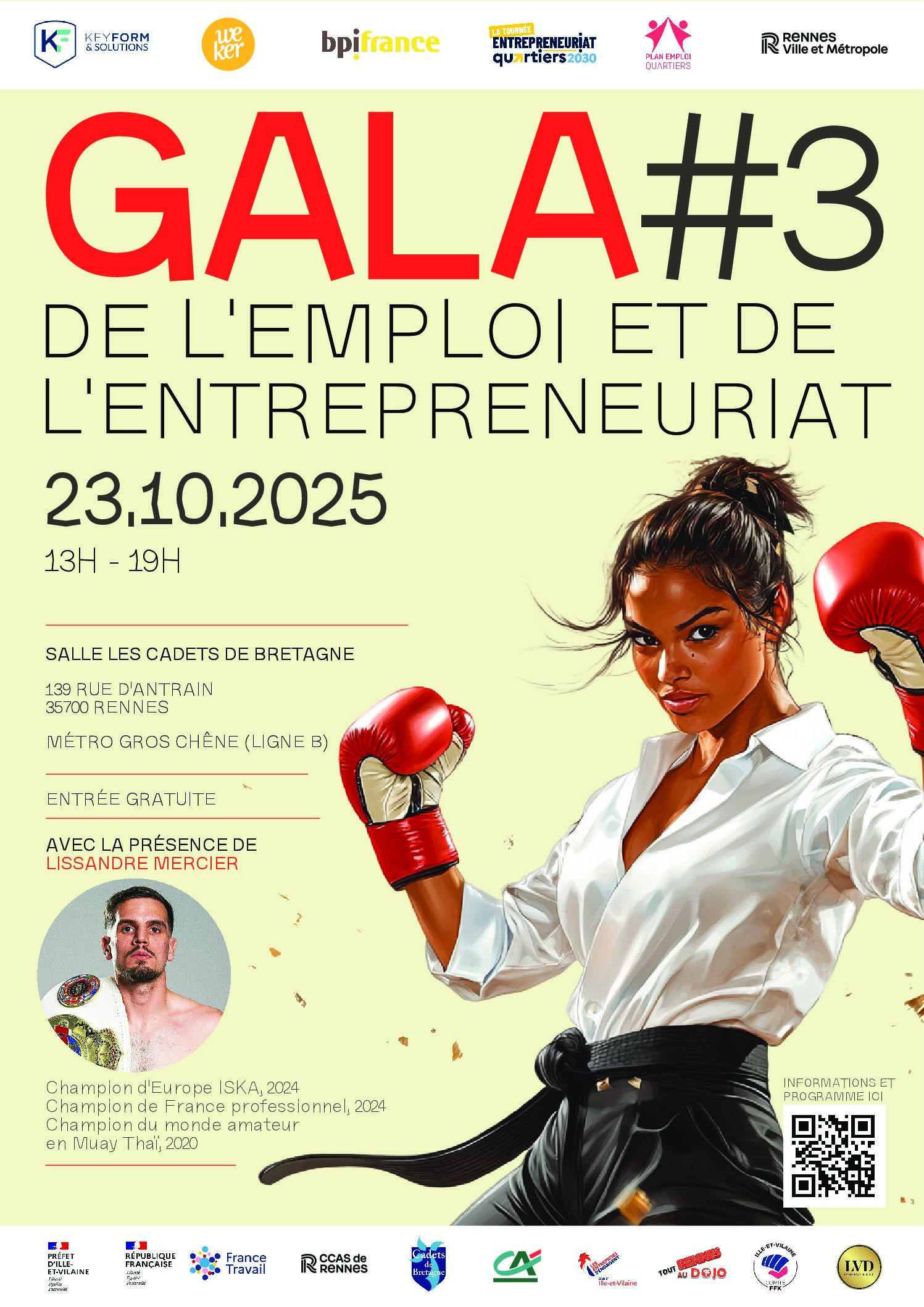 Le Gala de l’Emploi et de l’Entrepreneuriat est organisé par WE KER, Key Form&Solutions, Les Cadets de Bretagne, Bpifrance, l’association La Vie est un Dojo, l’association Tout Rennes au Dojo et Rennes Métropole (Plan Emploi Quartier), en partenariat avec France Travail et le CCAS.